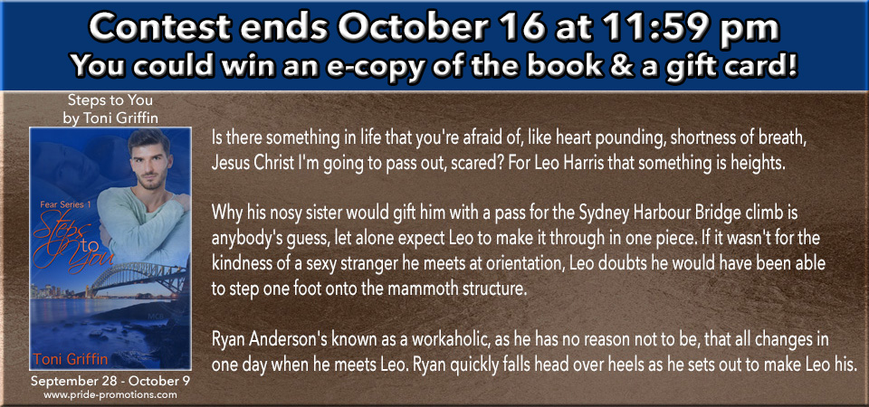 Enter to win a Rafflecopter Prize: 2 e-book copies of ‘Steps to You’ and 2 $5 Amazon Gift Cards. Must be 18 years of age or older to enter. Link and prizes provided by the author and Pride Promotions.