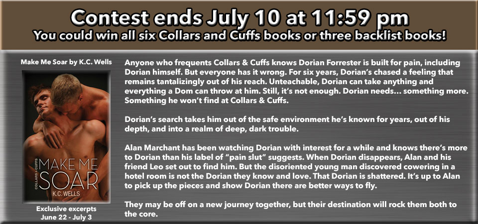 In the excerpt above, masochistic Army Ranger Everett Palmer meets His Grace, Finny Bainbridge for the first time. Finny has just rescued Ev from a violent assault by one of the more sex-crazed and disturbed patrons of Cuffed Links, an illegally operated underground BDSM club in Kabul Afghanistan. Hopefully you get a sense that there’s a lot of electricity passing between these two MCs. It only gets more intense as Finny draws Everett further into his illicit world.