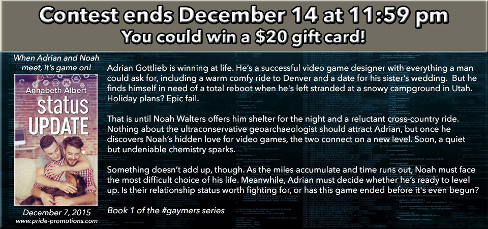 If Annabeth Albert hadn’t already made me a fan with her previous stories, this is the one that would have sealed the deal. Status Update, the first in a new #gaymer series, proves to be a sweet, sparkling romance, with filled with endearing characters that grab at your heart. That holds especially true of the main couple, both men are unusual, layered, and real. Throw in two irrepressible dog characters like Pixel and Ulysses that are a perfect match for their owners and I was in love from the moment the story rolled out in that campground’s off leash dog area in Utah.