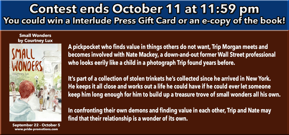 Enter to win a Rafflecopter Prize: $25 Interlude Press Gift Card to one grand prize winner plus copies of the Seven Tears at High Tide multi-format eBook to five winners. Must be 18 years of age or older to enter. Link and prizes provided by the author and Pride Promotions.