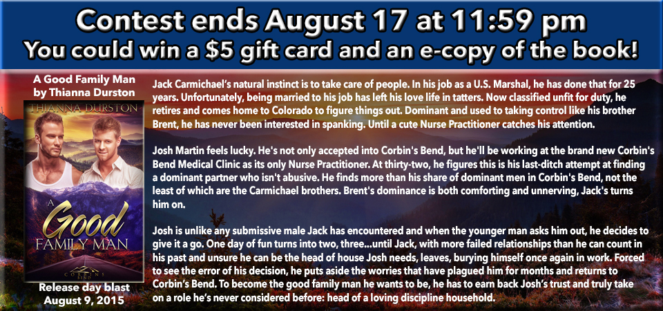 Enter to win a Rafflecopter Prize: $5.00 gift card and copy of ‘A Good Family Man’ on release. Must be 18 years of age or older to enter. Link and prizes provided by the author and Pride Promotions.